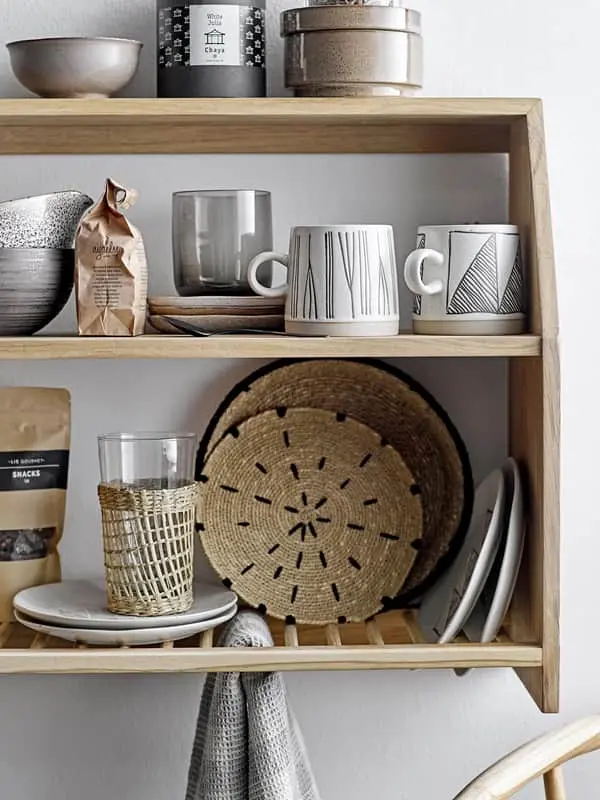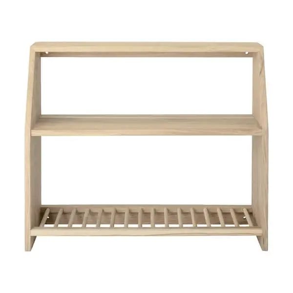 Få styr på krydderidåser og flasker i køkkenet og vis dine pæne tallerkener frem ved at arrangere dem på Carol hylden fra Bloomingville. Hylden er lavet i egetræ og har ribber på den nederste hylde, hvilket gør den velegnet til flasker eller til at hænge viskestykker over. Hylden måler L 60 x H 50 x B 21 cm.