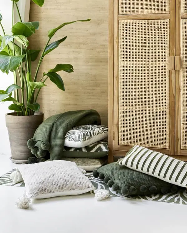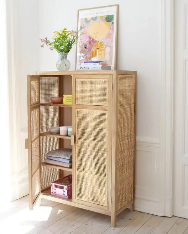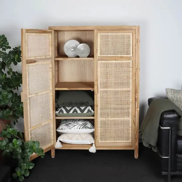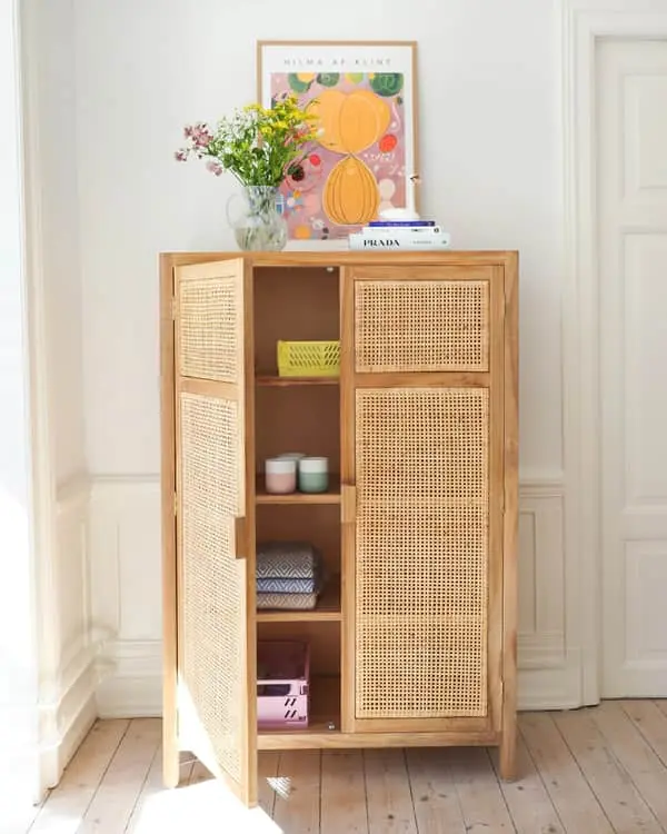 Smukt skab i naturlige materialer som teaktræ og rottingflet, der skaber helt nyt liv i indretningen.