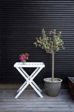 Bruger du også de fleste soltimer ude på altanen om sommeren? Så kan du sagtens tage det lille bakkebord eller blot bakken med dig til at stille kølige drikke fra på. Bordet er lavet i malet mahogni og tåler derfor også at blive brugt udendørs.