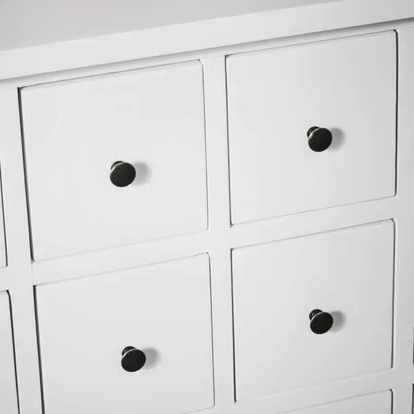 Den flotte kommode har 12 skuffer, hvilket gør den perfekt til opbevaring af alverdens ting og sager. Dens enkle og elegante look skaber en unik stemning i rummet og giver dit hjem liv og sjæl. Brug Ellen kommoden i entreen, stuen eller soveværelset og nyd synet at det iøjnefaldende møbel.