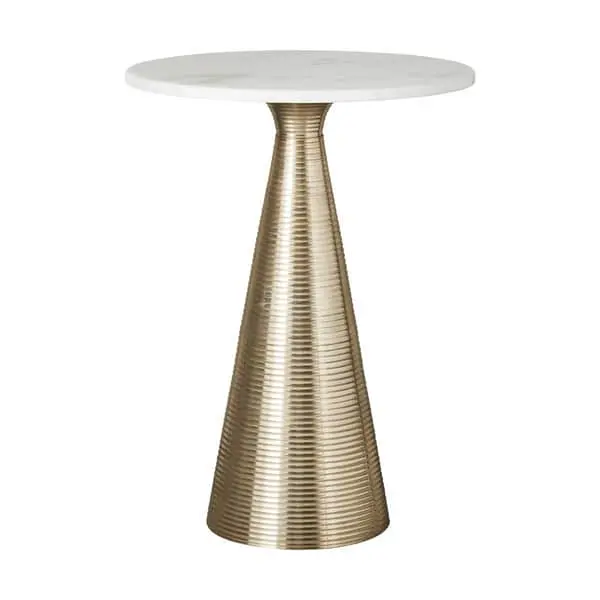Sidebordet er fremstillet i metal og har en hvid marmor bordplade og gulddetaljer, som vil passe ind i ethvert hjem. Da marmor er en natursten, vil mønsteret på bordpladen variere fra produkt til produkt. Bordet findes i to størrelser, som kan kombineres eller bruges hver for sig.