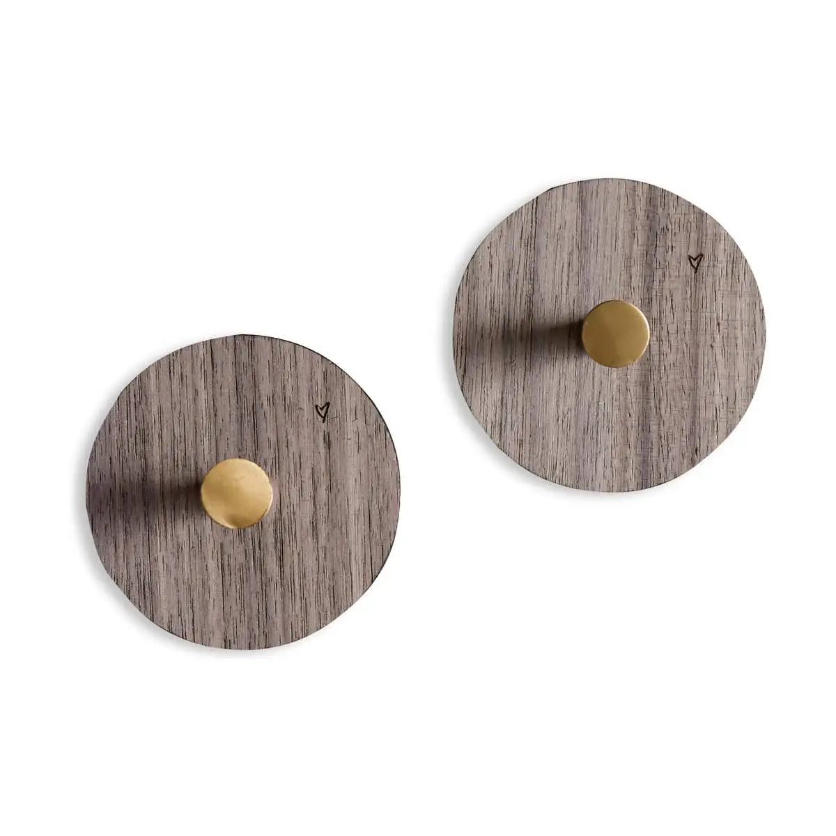 Lav en dekorativ væg med knager i forskellige farver og størrelser fra Minifabrikken. Knagerne har et enkelt design i lys eg eller valnød som giver en god kontrast, hvis du har en hvid eller lys væg.