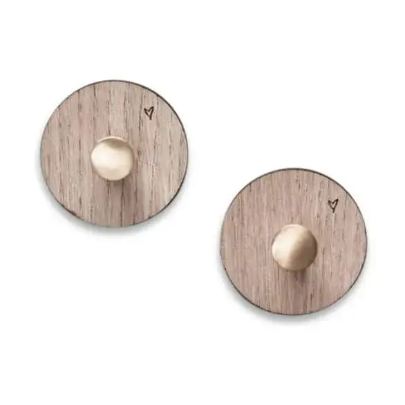 Lav en dekorativ væg med knager i forskellige farver og størrelser fra Minifabrikken. Knagerne har et enkelt design i lys eg eller valnød som giver en god kontrast, hvis du har en hvid eller lys væg.