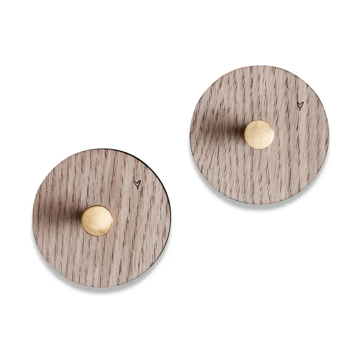Lav en dekorativ væg med knager i forskellige farver og størrelser fra Minifabrikken. Knagerne har et enkelt design i lys eg eller valnød som giver en god kontrast, hvis du har en hvid eller lys væg.